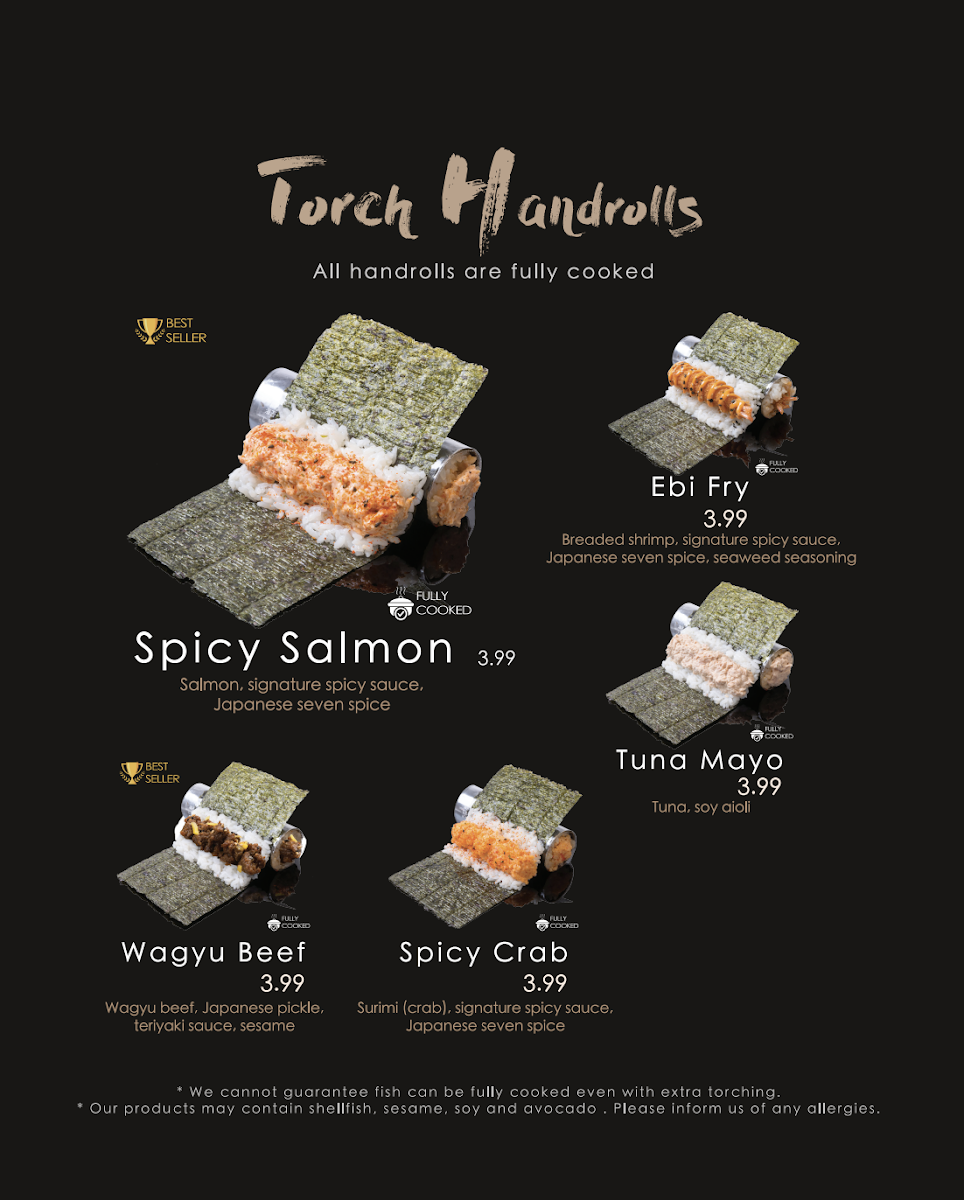 One of each type of Torch sushi (6 pc total), 1 spicy salmon handroll, 1 wagyu handroll. Includes spicy salmon, original salmon, truffle scallop, zesty shrimp, BBQ unagi, and fantastic 4 sushi.